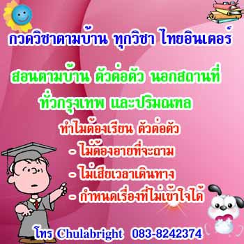 Chula Bright รับสอนพิเศษตามบ้าน ตัวต่อตัว นัดนอกสถานที่ นัดวัน เวลา สถานที่ได้ สอนทุกวิชา ทุกหลักสูตร ติวเตอร์คุณภาพ สอนพิเศษตัวต่อตัว ติดเดี่ยว กลุ่ม สอนตั้งแต่ อนุบาล ประถม ม.ต้น ม.ปลาย มหาวิทยาลัย ปริญญาโท สอบแข่งขัน ชิงทุน เรียนต่อ สอบต่อนอก เราเป็นที่ปรึกษาให้คุณได้