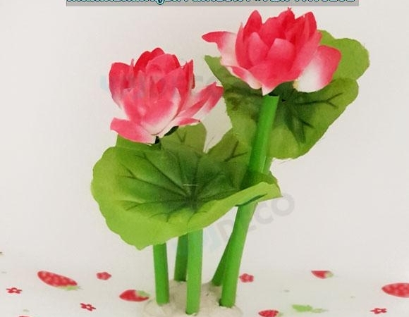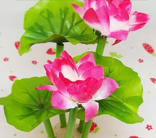 ดอกบัวเทียมสีชมพูม่วง-ขาว ใช้สำหรับตกแต่งตู้ปลา ตกแต่งบ่อน้ำ/บ่อปลา หรือบางแบบสามารถนำไปใส่กระถางวางบนหิ้งพระก็ได้ ขนาดโดยประมาณ ฐานกว้าง 6 ซม. ลำต้นสูง 20 ซม.